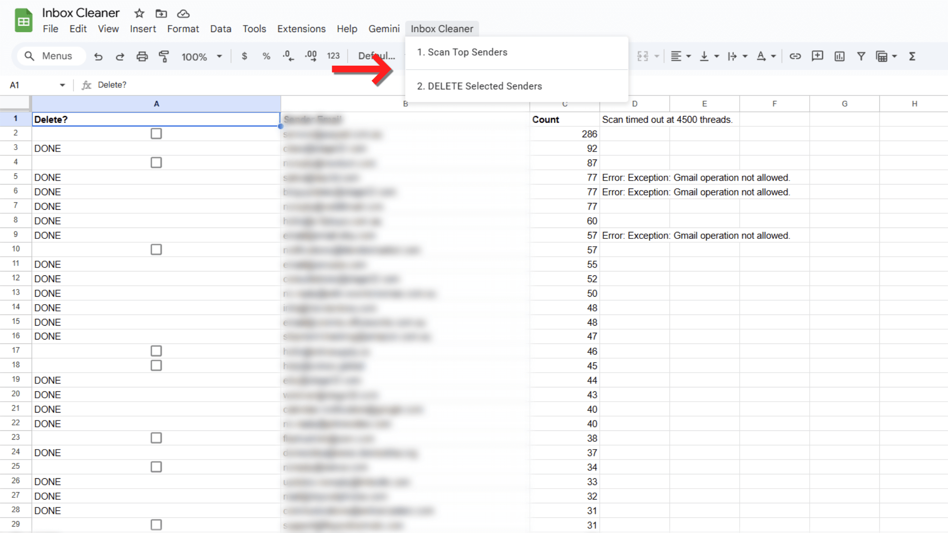 To delete emails, simply select the cell (or row) of the sender you want to purge, and click Inbox Cleaner > DELETE selected senders.